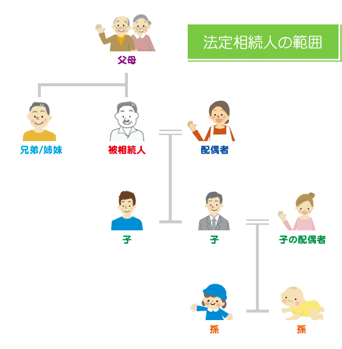 被相続人(亡くなられた方)の財産を相続する権利がある人を法定相続人といい、相続人の範囲は民法で定められています。遺言書等で特別に指定している人がいる場合を除いて、基本的に民法の規定が適用されます。
