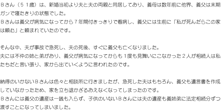 長年に渡り病人の母を1人で看ていた長女のAさん(38歳)。母には日頃より「全財産は全てAに相続する」と言われていました。父はすでに他界しており、母はかなりの資産家でした。